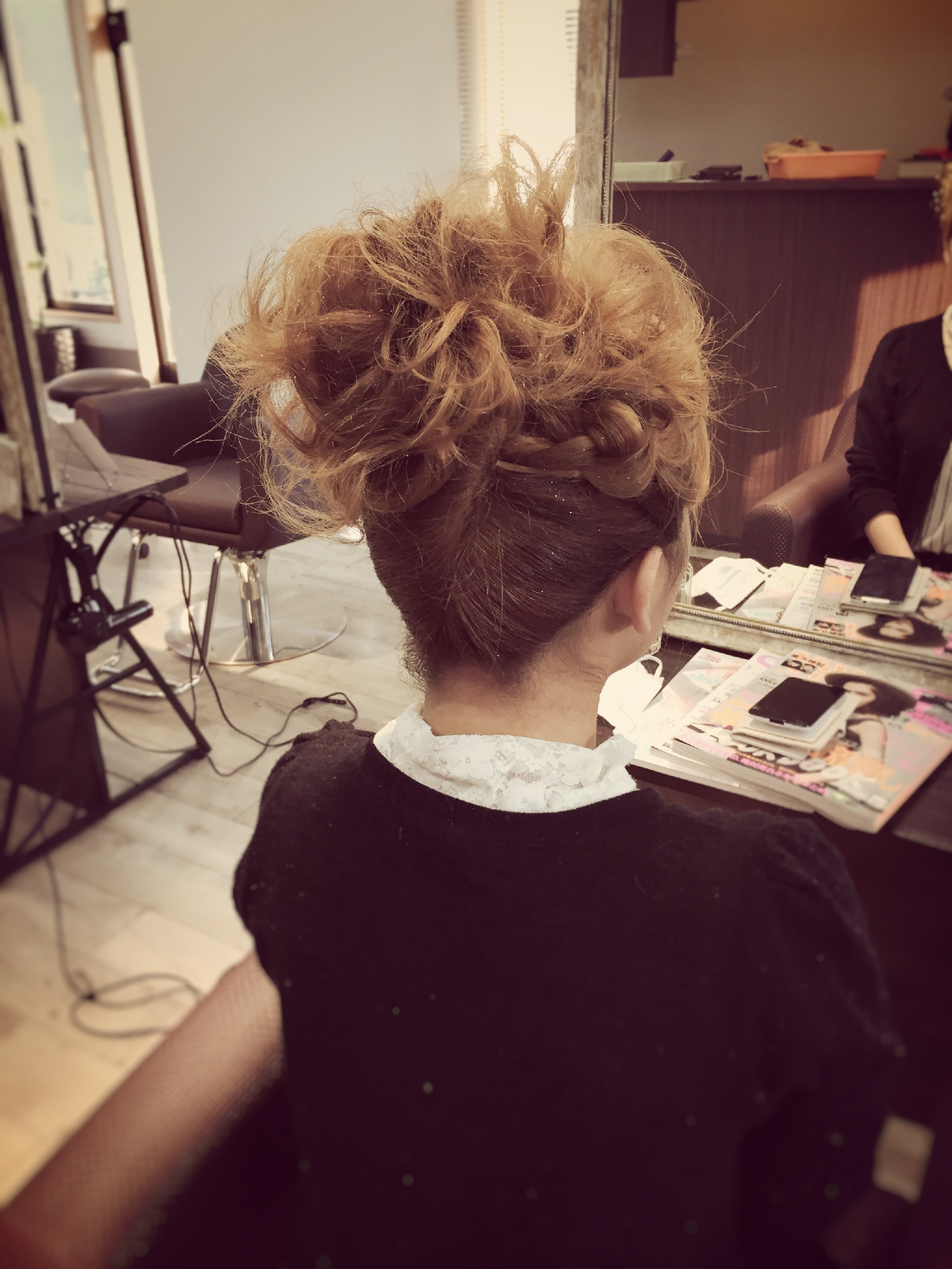 こんばんは(^^)本日のお客様なんですが、夜のパーティーに出席されるらしく、ヘアセットにお越しいただきました。スッキリあげたいとオーダーでしたので、最近波巻きセットが多かったので、今回は波に乗らずに、夜会巻きでいってみました。仕上がりはこちら